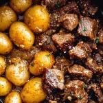 - Pour the garlic butter over the beef and potatoes, stirring to coat.