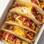 Making baked breakfast tacos is straightforward and enjoyable. You start by cooking the bacon and potatoes. Then, layer the ingredients in the tortillas and bake until everything is warm and golden. It’s a simple method that gives you a tasty meal without much fuss.